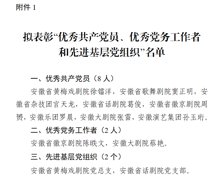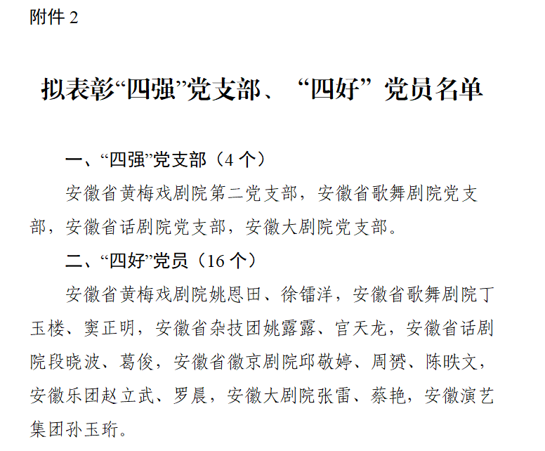 根據(jù)集團(tuán)黨委《關(guān)于開(kāi)展“優(yōu)秀共產(chǎn)黨員、優(yōu)秀黨務(wù)工作者和先進(jìn)基層黨組織”評(píng)選活動(dòng)的通知》《關(guān)于開(kāi)展“四強(qiáng)”黨支部評(píng)定、“四好”黨員選樹(shù)工作的方案》要求,經(jīng)各基層黨組織推薦申報(bào)、黨委會(huì)議研究決定,擬表彰徐鐳洋等8名同志為“優(yōu)秀共產(chǎn)黨員”,陳昳文等2名同志為“優(yōu)秀黨務(wù)工作者”,安徽省黃梅戲劇院黨總支等2個(gè)黨組織為“先進(jìn)基層黨組織”,安徽省黃梅戲劇院第二黨支部等4個(gè)黨支部為“四強(qiáng)”黨支部,姚恩田等16名同志為“四好”黨員?,F(xiàn)予以公示(具體名單附后)。